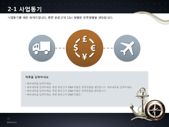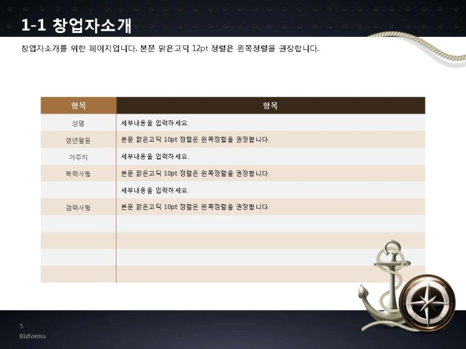 *비즈폼 표준작성법은 파워포인트2007버전(pptx) 이상에서 최적화 되어 있으며, 2003버전(ppt)에서는 일부 사용이 제한됩니다. 창업에 대한 사업계획서(pptx2007버전)입니다. 어느 분야에도 적용이 되는 표준 목차 및 전문가 조언, 한눈에 보여주는 원페이지 요약본, 숫자만 입력하면 자동 완성되는 자동차트, 프레젠테이션에 활용 할 수 있는 이미지소스가 포함되어 있습니다.