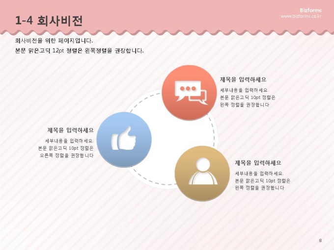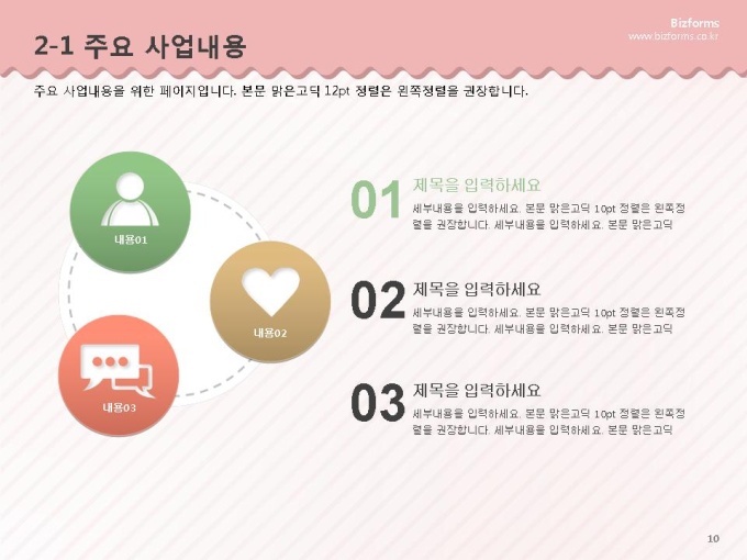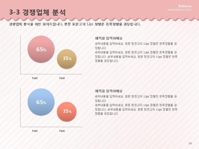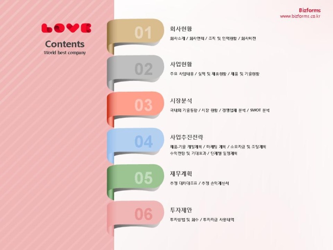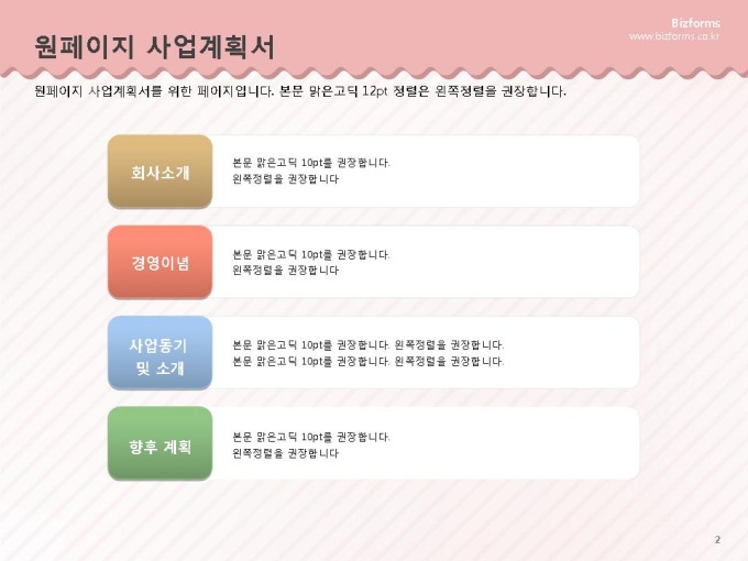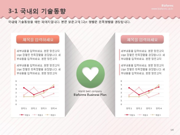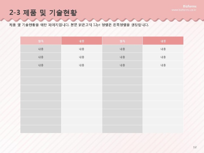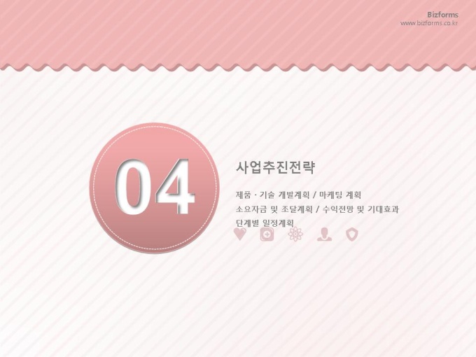*비즈폼 표준작성법은 파워포인트2007버전(pptx) 이상에서 최적화 되어 있으며, 2003버전(ppt)에서는 일부 사용이 제한됩니다. 투자유치에 대한 사업계획서(pptx2007버전)입니다. 어느 분야에도 적용이 되는 표준 목차 및 전문가 조언, 한눈에 보여주는 원페이지 요약본, 숫자만 입력하면 자동 완성되는 자동차트, 프레젠테이션에 활용 할 수 있는 이미지소스가 포함되어 있습니다.