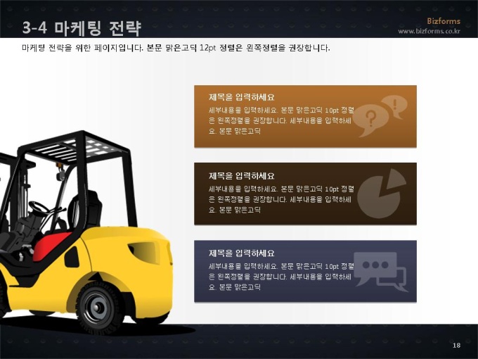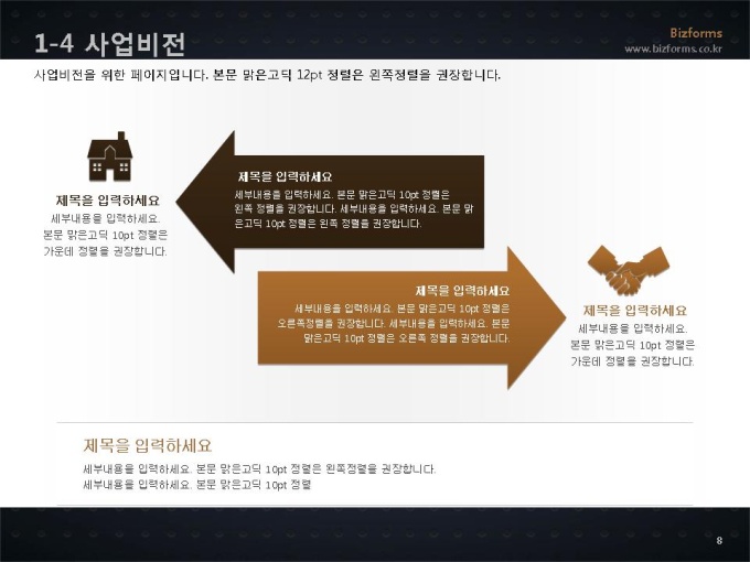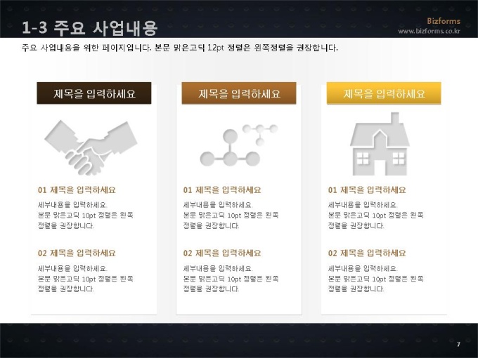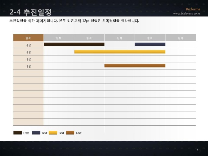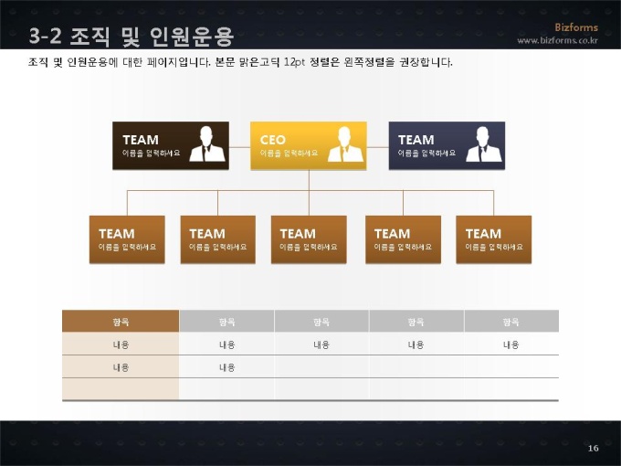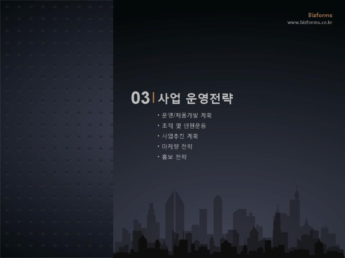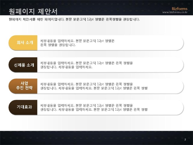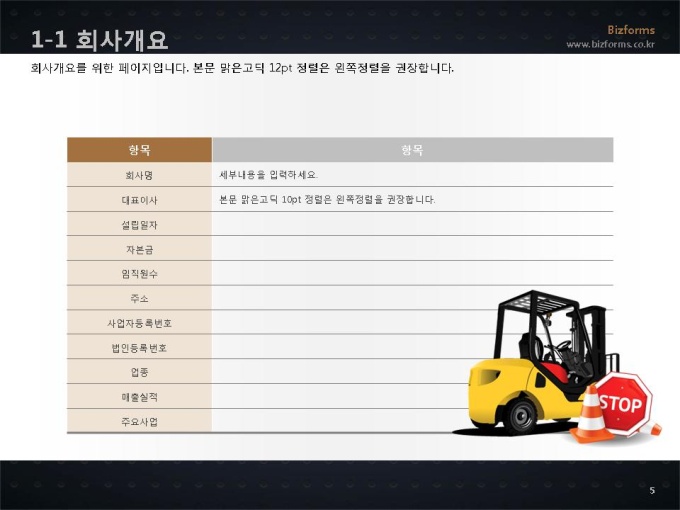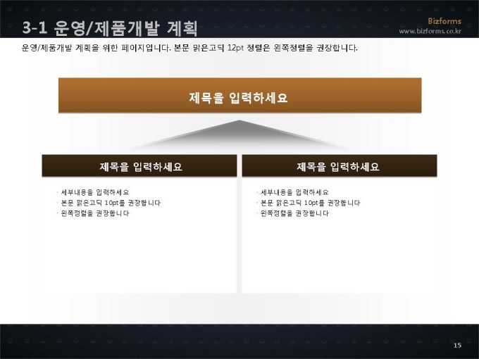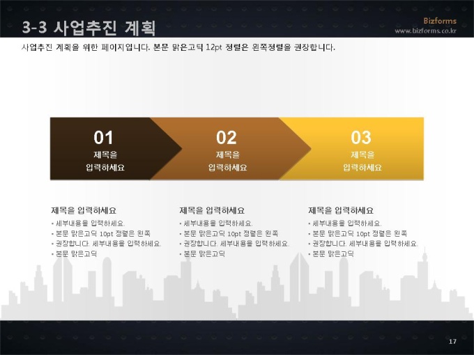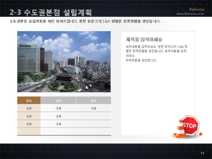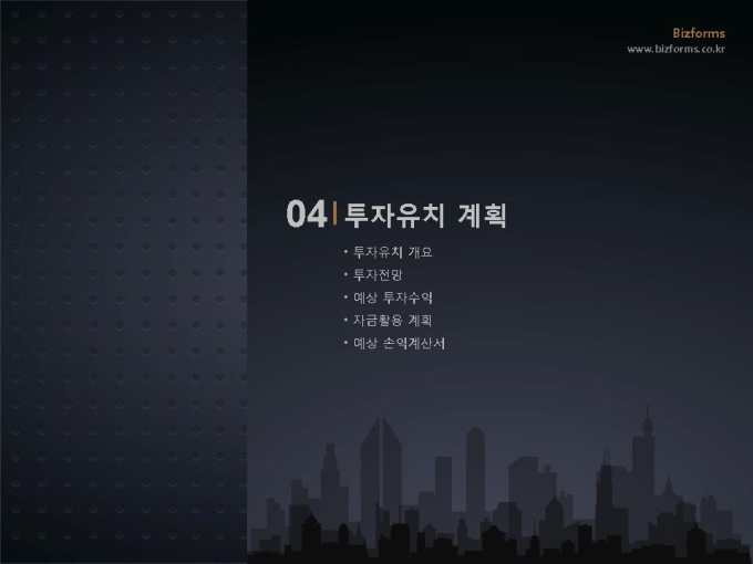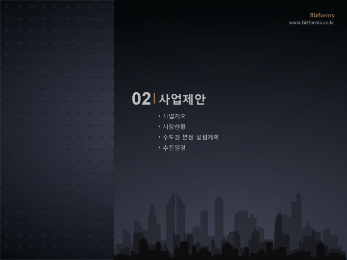 *비즈폼 표준작성법은 파워포인트2007버전(pptx) 이상에서 최적화 되어 있으며, 2003버전(ppt)에서는 일부 사용이 제한됩니다. 사업투자에 대한 제안서(pptx2007버전)입니다. 어느 분야에도 적용이 되는 표준 목차 및 전문가 조언, 한눈에 보여주는 원페이지 요약본, 숫자만 입력하면 자동 완성되는 자동차트, 프레젠테이션에 활용 할 수 있는 이미지소스가 포함되어 있습니다.