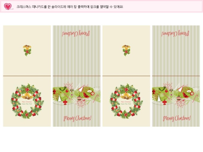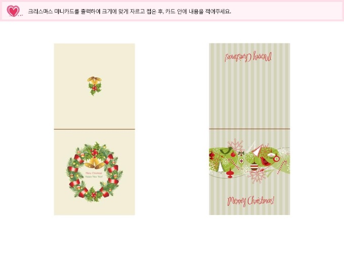 크리스마스 미니카드 2종으로 구성되어 있어 출력하여 사용할 수 있습니다. 출력하여 크기에 맞게 자르고 접은 후, 카드 안에 내용을 적어주세요. DM, 거래처, 고객, 지인, 친구, 가족에서 인사와 안부를 전할 때 활용하세요.