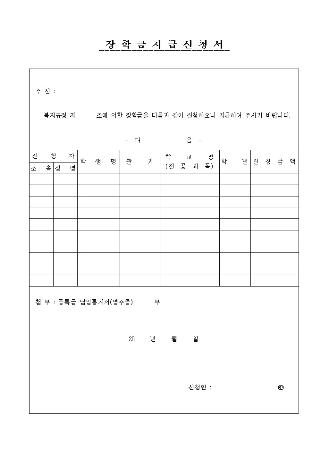 9,000원/월교내 복지규정에 의한 장학금을 신청할때 사용하는 양식입니다.