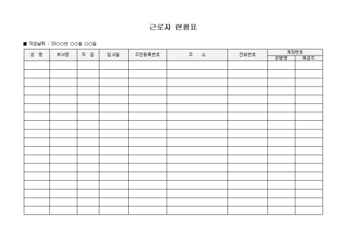 근로자 현황표입니다. 현 당사내의 근로자 현황에 대한 집계표를 나타낼 수 있는 서식입니다. 세부내용으로는 성명, 부서명, 입사일, 직급 등으로 구성되어 있습니다.