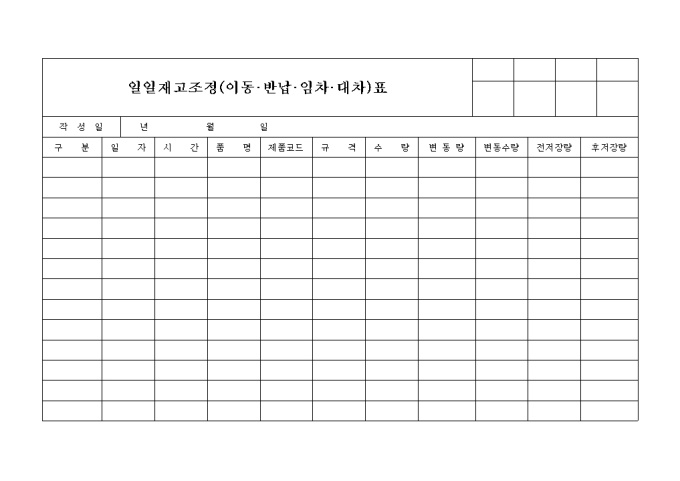 일별 제품의 규격,수량,변동량,전저장량등으로 구분하여 재고량을 조정하는 양식입니다.