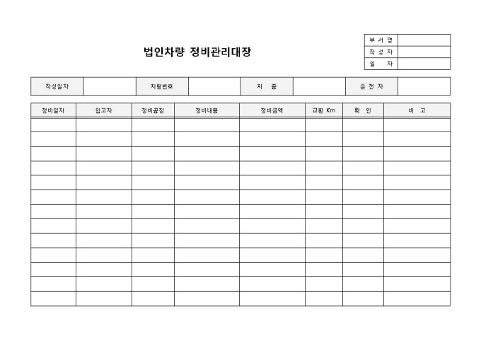 9,000원/월법인차량관리입니다. 차종, 차량번호, 운행책임, 주행횟수 등의 항목으로 구성되어 있습니다. 법인차량의 정비일자 및 정비내용 점검에 용이합니다.