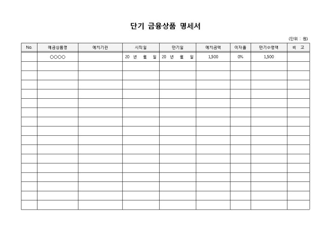 단기금융상품명세서 입니다. 예금상품명, 예치기관, 시작일, 만기일, 예치금액, 이자율, 만기수령액 등으로 구성되었습니다. 예금상품별 이자율 및 만기수령액 작성에 편리합니다.