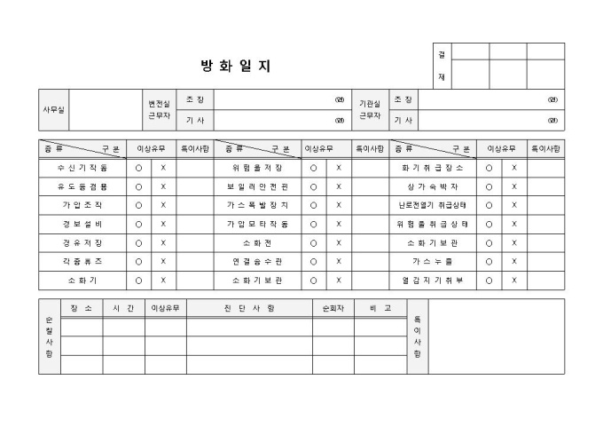 방화일지 입니다. 사무실, 종류, 구분, 이상유무, 특이사항, 기사, 조장 등으로 구성되었습니다. 방화품의 이상유무를 점검하고 관리하는데 효과적입니다.