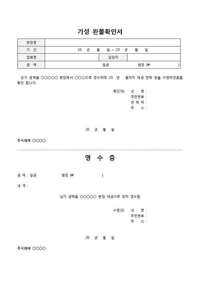 기성확인서 입니다. 현장명, 기간, 업체명, 금액, 확인자, 성명, 연락처 등으로 구성되었습니다. 완불내용을 간략하게 작성할 수 있으며, 완불 확인 및 영수증 발급에 용이합니다.