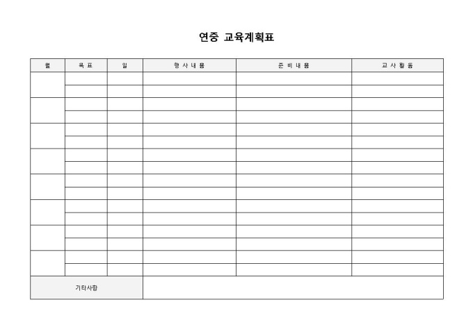 가로형 년중계획표 입니다. 목표, 일, 행사내용, 행사준비, 교사활동 등으로 구성되었습니다. 월별 목표를 간편하게 기재하고 그와 관련된 행사내용 및 준비사항들을 간편하게 작성하고 계획할 수 있습니다.