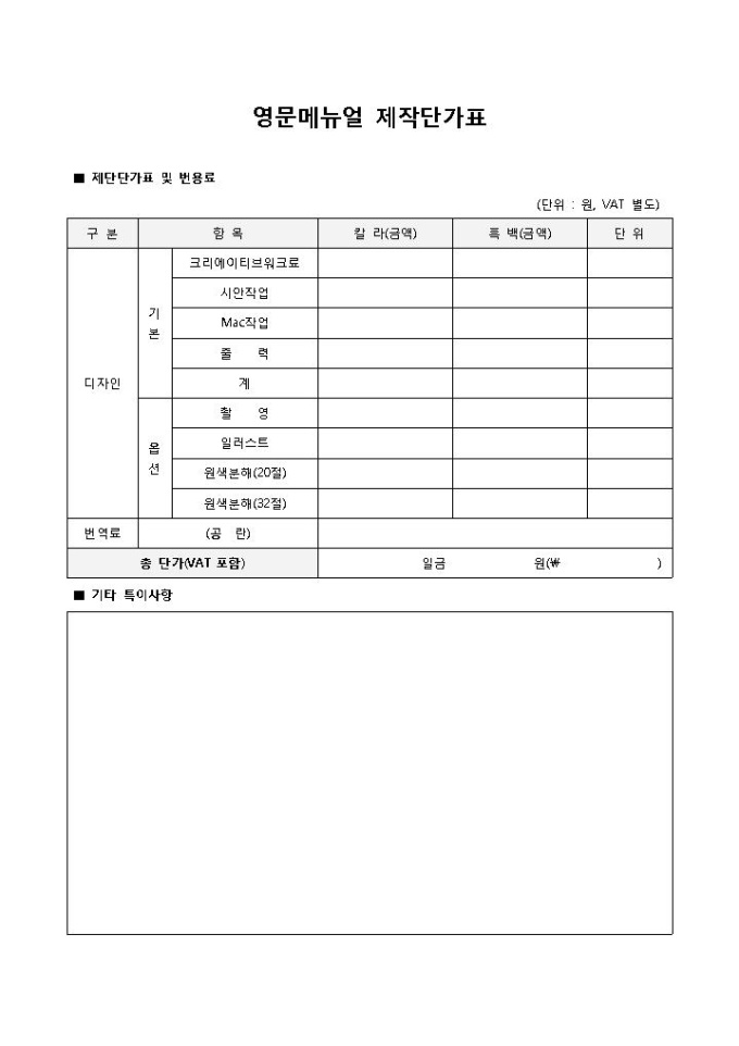단가표(영문메뉴얼제작)