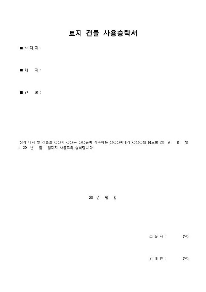 토지 건물 사용승락서 입니다. 소재지, 대지, 건물, 내용 등으로 구성되었습니다. 토지 및 건물사용 내역을 간편하게 기재하고 신청할 수 있습니다.