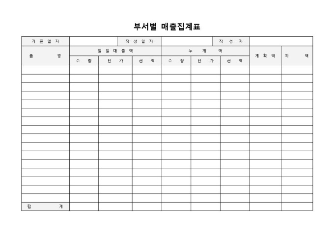 부서별 매출집계표 입니다. 품명, 수량, 단가, 금액, 계획액, 차액, 작성일자 등으로 구성되었습니다. 제품별 일일매출액 및 누계액등을 작성하고 집계하는데 용이합니다.