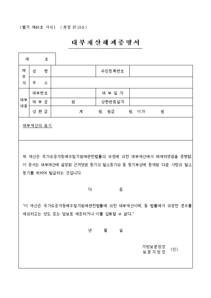 9,000원/월대부 재산 해제증명서 양식입니다. 국가유공자등예우 및 지원에 관한 법률의 규정에 의한 대부재산에서 해제하였음을 증명 / 이 증서는 대부재산에 설정된 근저당권 등기의 말소등기와 동 등기부상에 등재된 다음 사항의 말소등기를 위하여 발급하는 별지 제40호<개정 97.10.6> 증명서 서식입니다.