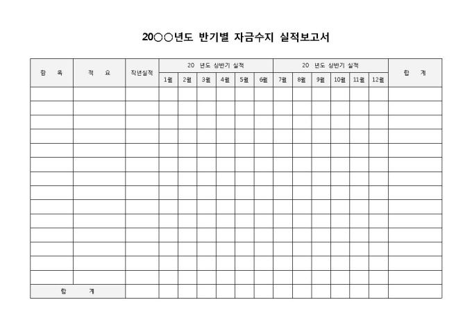 9,000원/월반기별 자금수지 실적보고서 입니다. 항목, 적요, 작년실적, 상반기 실적 등으로 구성되었습니다. 항목별 실적내역 및 보고에 용이합니다.