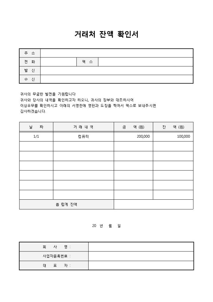 거래처 잔액 확인서 입니다. 주소, 전화, 발신, 수신, 팩스, 날짜, 거래내역, 금액, 잔액 등으로 구성되었습니다. 날짜별 거래 내역 및 잔액 확인에 용이합니다.