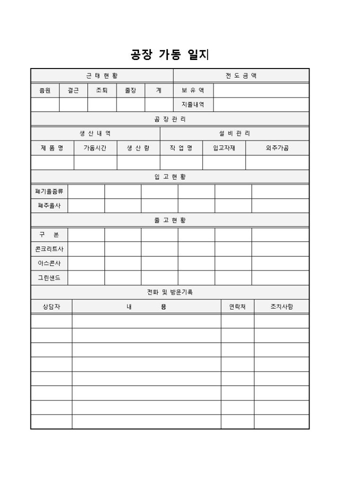 9,000원/월공장가동일지 입니다. 총원, 결근, 출장, 조퇴, 계, 보유액 등으로 구성되었습니다. 일일 가동현황 및 방문기록 관리에 용이합니다.