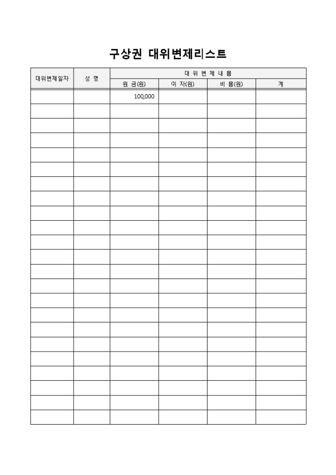 9,000원/월구상권 대위변제리스트 입니다. 대위변제일자, 성명, 원금, 이자, 비용, 계 등으로 구성되었습니다. 변제일자별 내용 작성 및 금액 산출에 효과적입니다.
