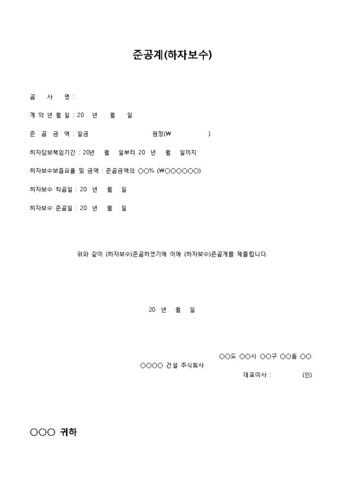9,000원/월준공계(하자보수)입니다. 공사명, 계약년월일, 준공금액, 하자담보책임기간, 하자보수보증요율 및 금액 등의 항목으로 구성되어 있습니다. 간단한 양식의 하자보수 준공에 대한 준공계 양식입니다.