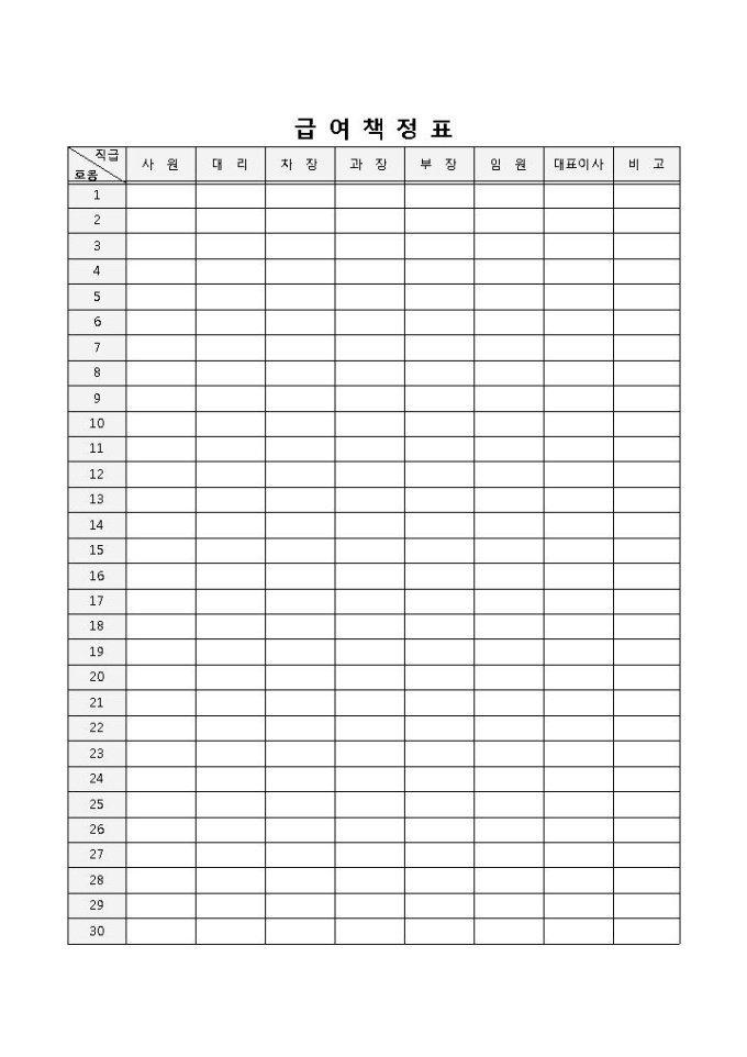 9,000원/월급여정책표 입니다. 사원, 대리, 차장, 과장, 부장, 임원, 대표이사 등으로 구성되었습니다. 인원별 호봉에 따른 급여액 작성 및 공고에 효과적입니다.