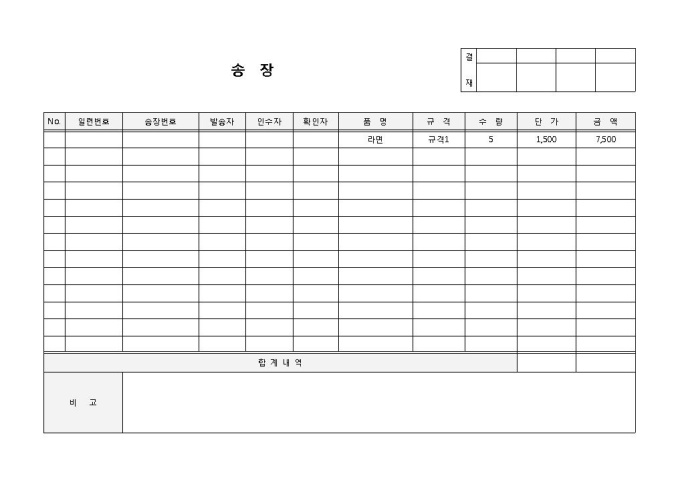 9,000원/월송장 입니다. 일련번호, 송장번호, 발송자, 인수자, 확인자 등으로 구성되었습니다. 각 송장별 내용 작성 및 금액 산출에 효과적입니다.
