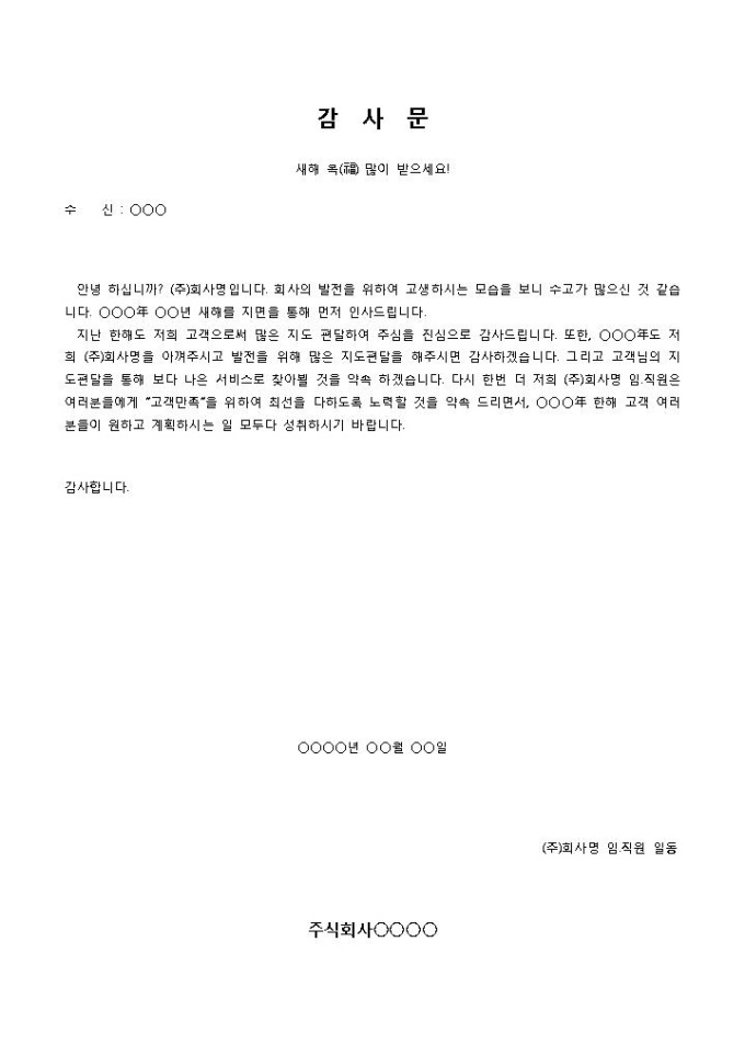 9,000원/월신년 감사의 인사가 첨부된 감사문 입니다. 본사를 이용하고 있는 고객에게 발송되는 문건이며, 내용의 첨삭이 용이한 양식입니다.