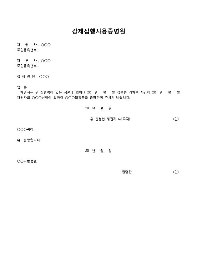 9,000원/월강제집행(사용증명원)입니다. 채권자, 채무자, 집행권원 등의 항목으로 구성되어 있습니다. 채권자의 가처분 신청을 증명하는 내용의 강제집행사용증명원 양식입니다.