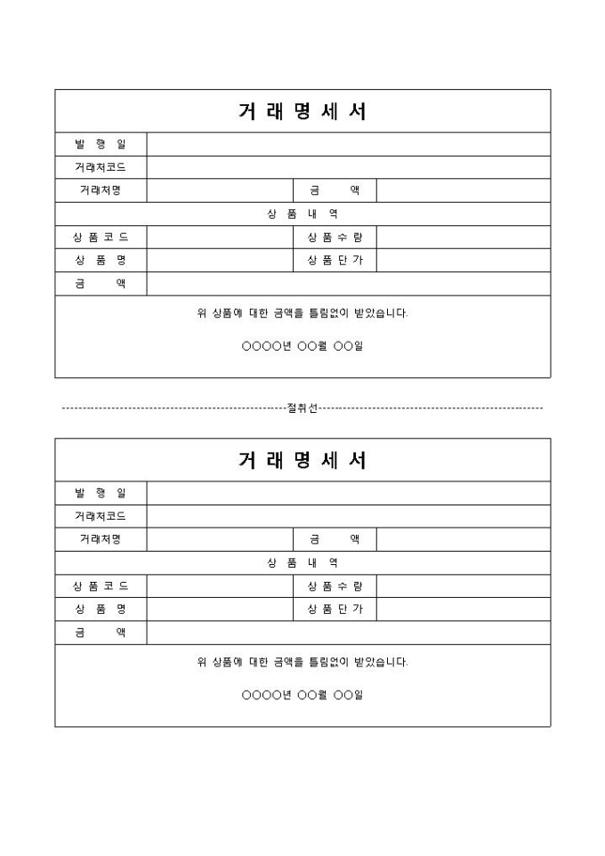 9,000원/월거래명세서 입니다. 발행일, 거래처코드, 거래처명, 금액, 상품수량 등으로 구성되었습니다. 거래물품에 대한 총액 파악 및 부관 증여에 용이한 양식입니다.