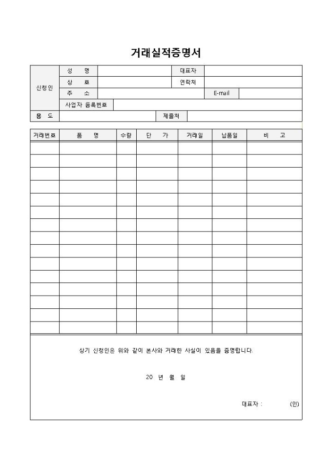 거래실적증명원 입니다. 신청인, 거래번호, 품명, 단가, 수량 등으로 구성되었으며, 기록 및 첨삭에 효과적인 양식입니다.