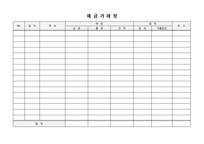 9,000원/월예금 거래장 양식 입니다. No., 일자, 적요, 예금, 결재, 등으로 구성되었습니다. 입, 출금에 따른 잔액량의 총액 파악에 용이하며, 그에 따른 결재자 및 특이사항 기입에 효과적입니다.
