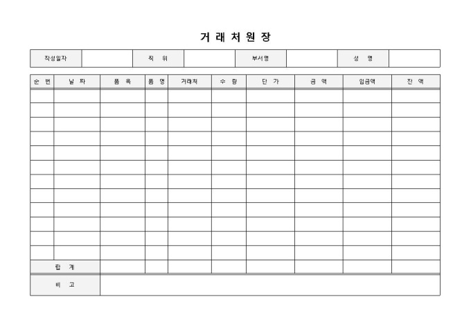 거래처원장 입니다. 순번, 날짜, 품목, 거래처, 수량, 단가 등으로 구성되었습니다. 단가에 따른 금액을 확인하고 잔금파악에 효과적입니다.