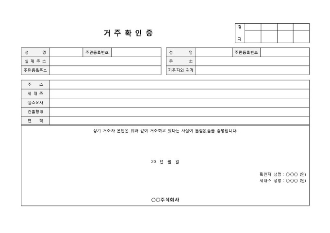 거주확인증 입니다. 성명, 실제주소, 주민등록번호, 거주자와의 관계, 주민등록주소, 주소, 세대주 등으로 구성되었습니다. 확인증 불출 및 점검에 용이합니다.