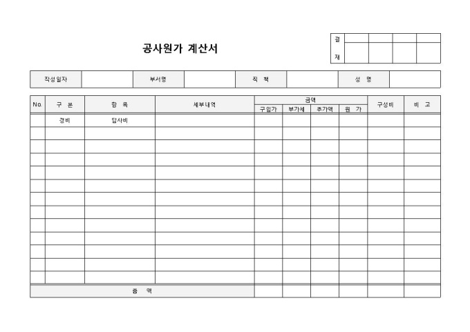 9,000원/월건설공사원가계산서 입니다. 부서명, 직책, 성명, 항목, 세부내역, 금액, 등으로 구성되있습니다. 구입가, 부가세, 추가액을 통해 원가 계산 및 총액 파악에 효과적입니다.