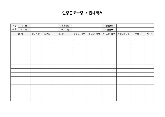 시간외근로수당지급내역(가로)입니다. 근무자의 인적사항, 일자, 출,퇴근 시간, 월 급여 등의 항목으로 구성되어 있습니다. 해당 직원에 대한 다수의 시간외 근로 수당 지급내역을 작성할 수 있습니다.