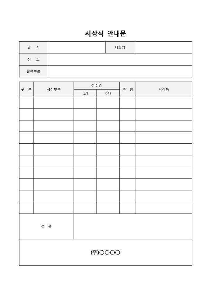 시상식 안내문 입니다. 일시, 장소, 대회명, 수량, 시상품, 시상부분 등으로 구성되었습니다. 시상식 관련 내용을 작성할때 보다 편리하게 이용할 수 있습니다.