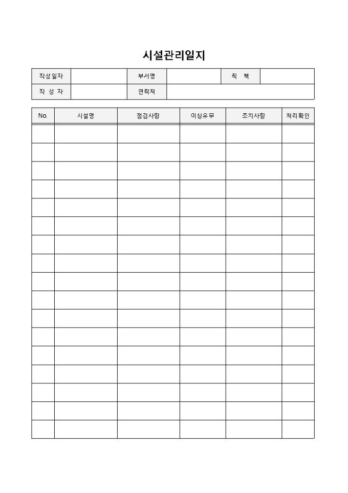 9,000원/월시설관리일지 입니다. 작성일자, 부서명, 연락처, 직책, 점검사항, 시설명 등으로 구성되었습니다. 각 시설별 점검사항 기록에 용이하며, 이를통해 이상유무를 파악하고 그에 대한 조치사항 작성에 편리한 양식입니다.