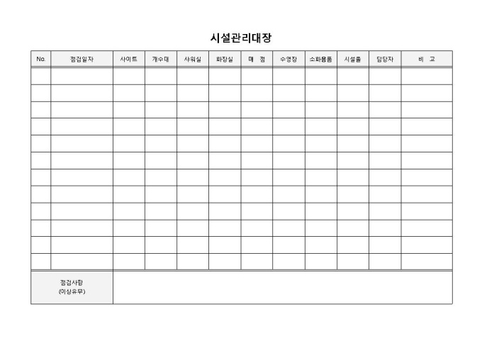 9,000원/월시설관리대장 입니다. 점검일자, 사이트, 매점, 수영장, 담당자, 계수대, 시설물, 소화용품 등으로 구성되었습니다. 점검일자별 이상유무 파악 및 특이사항 기록에 효율적입니다.
