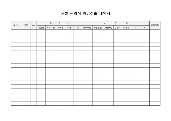 9,000원/월시설관리직입니다. 관리처, 성명, 일수, 지급, 차감액 등의 항목으로 구성되어 있습니다. 시설관리직에 대한 임금산출 내역을 기록할 경우 사용할 수 있는 양식입니다.