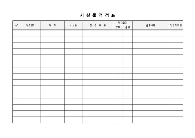 시설물 점검표 입니다. 구분, 점검일자, 점검내용, 점검결과 등으로 구성되었습니다. 시설물의 점검사항 작성 및 이상유무 내역을 통해 시설물의 특이사항을 확인하고 보고하는데 용이합니다.