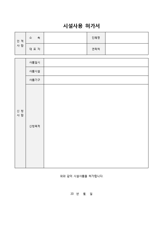 9,000원/월시설사용허가서 입니다. 인적사항, 신청사항으로 구성되었습니다. 신청자의 인적사항 및 신청내역 작성이 손 쉬운 양식입니다.