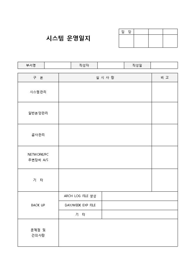 시스템운영일지입니다. 구분, 실시사항, 비고 등의 항목으로 구성되어 있습니다. 회사에서 회사 전반적인 시스템 운영에 관한 사항을 간략하게 기록하여 관리할 수 있는 양식입니다.