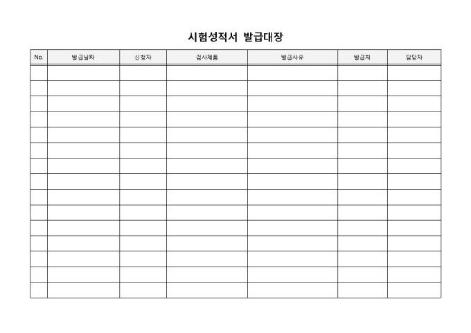 시험성적서 발급대장 입니다. 발급일자, 신청자, 검사제품, 발급사유, 발급처 등으로 구성되었습니다. 검사제품 및 발급신청사유, 발급자 관리가 손쉬운 양식입니다.