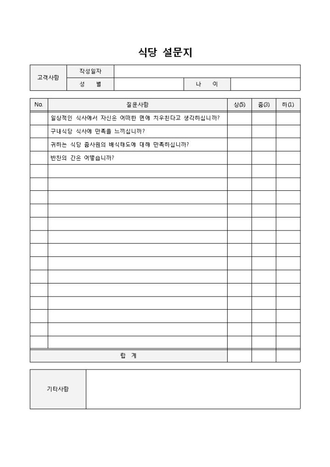 9,000원/월식당설문지 입니다. 고객사항, 작성일자, 성별, 질문사항 등으로 구성되었습니다. 예시문이 작성되있으며, 기존 내용을 수정하고 기타사항을 통해 설문자의 느낀점을 파악하는데 효과적입니다.