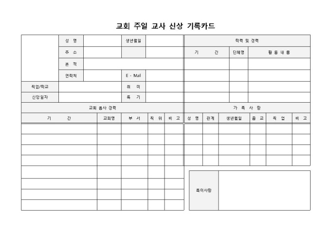 신상기록카드 입니다. 성명, 주소, 학력 및 경력, 기간, 단체명, 활동내용 등으로 구성되었습니다. 교사의 특이사항 기록에도 용이합니다.