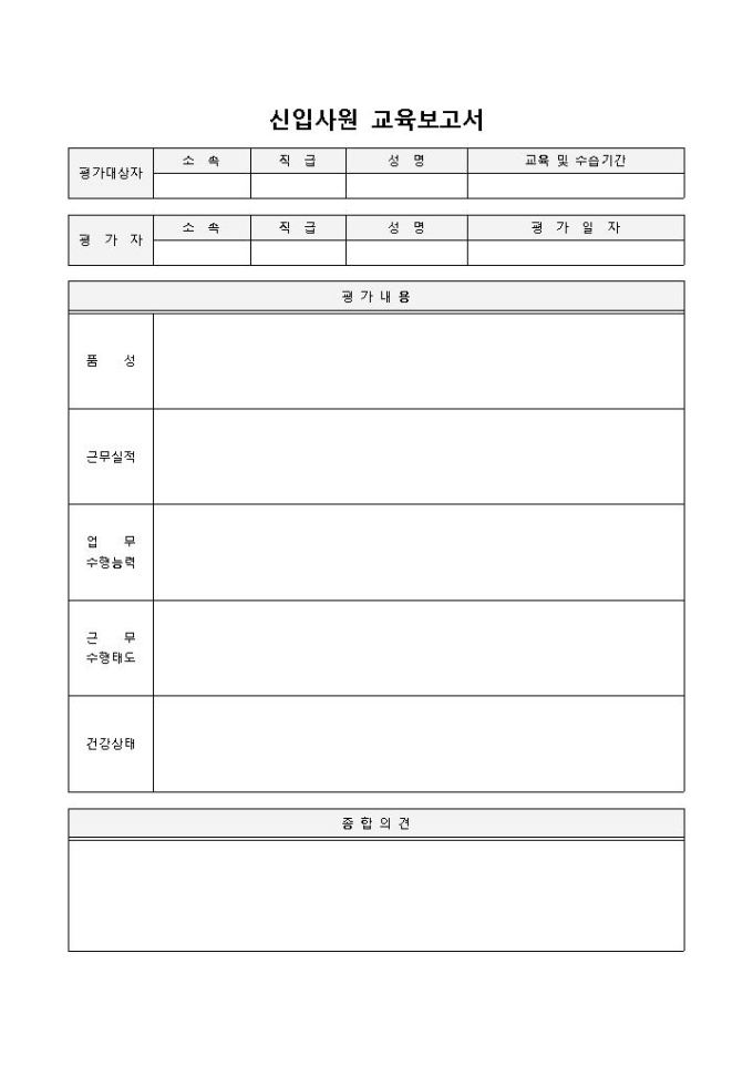 신입사원 교육보고서 입니다. 소속, 직급, 성명, 수습기간, 평가내용 등으로 구성되었습니다. 항목별 평가내용 작성 및 결과 보고에 효율적입니다.