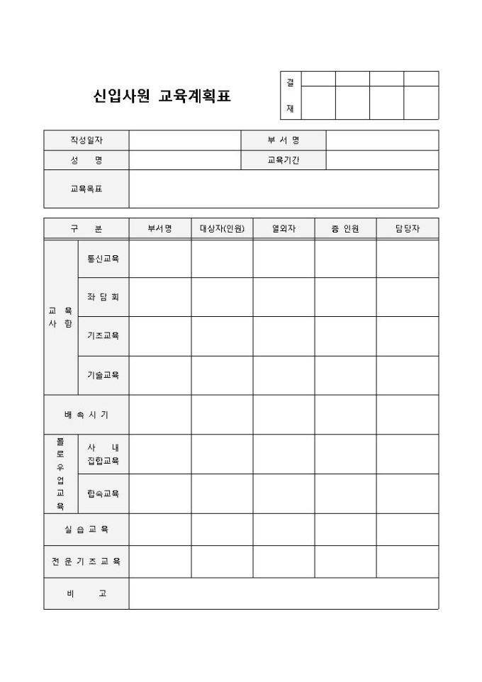 9,000원/월신입사원 교육계획표 입니다. 교육기간, 교육목표, 부서명, 교육사항, 교육내용 등으로 구성되었습니다. 부서별 인원파악 및 교육내용 계획에 편리한 양식입니다.