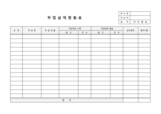 9,000원/월부업실적현황표 입니다. 성명, 부업명, 작업내용, 작업대상 수령, 작업완료 발송 등으로 구성되었습니다. 실적금액을 계산하고 그에 따른 특이사항 기록에 용이합니다.