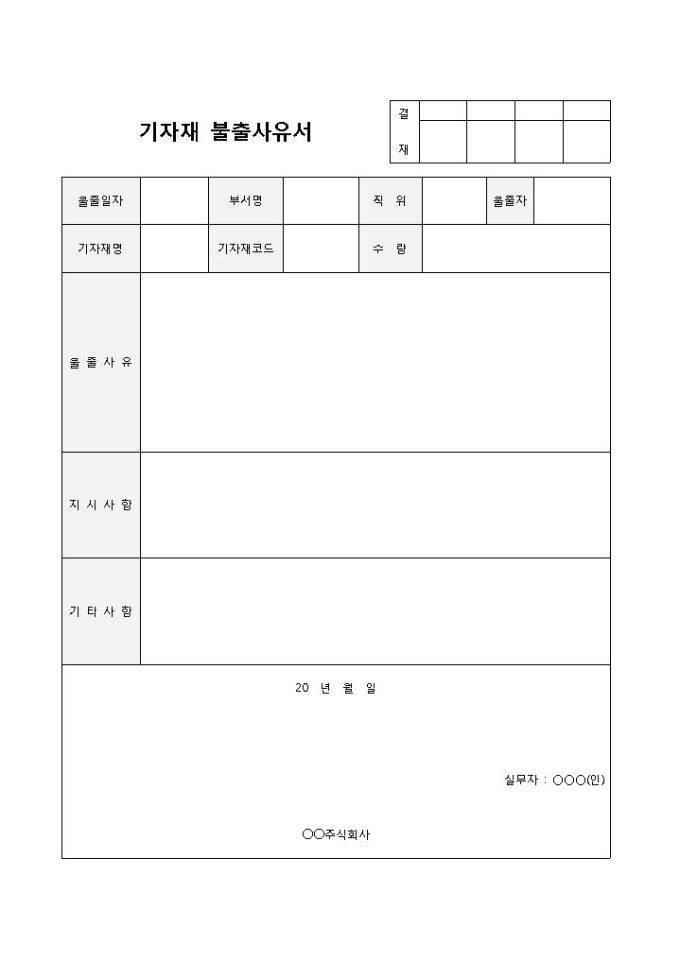 실험기자재 불출사유서 입니다. 불출일자, 기자재명, 가자재코드, 수량 등으로 구성되었습니다. 불출사유 및 지시사항을 기록하고 그에 따른 추가사항 기입에 용이합니다.
