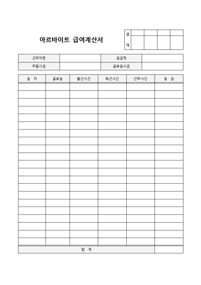 9,000원/월아르바이트 급여계산서 입니다. 근무자명, 주중시급, 퇴근시간, 근무시간, 일급, 주중시급, 공휴일시급 등으로 구성되었습니다. 근무일수별 급여액 계산에 효과적입니다.