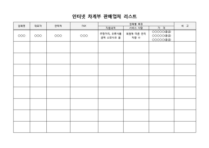 인터넷차계부 판매업체 리스트 입니다. 업체명, 대표자, 연락처, FAX, 등으로 구성되었습니다. 업체별 지원내역 및 서비스사항 기재에 용이합니다. 판매금액을 작성하고 비교분석하는데 효과적입니다.