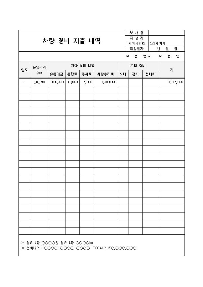9,000원/월차량 경비와 그외 기타 경비에 대해 일정 기간동안 지출의 내용을 기록한 차량경비 지출내역 양식입니다. 일자, 운행거리, 차량 경비 내역, 기타 경비, 계 등의 항목으로 구성되어 있습니다.