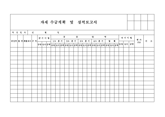 자재수급계획 및 실적보고서 양식입니다. 공장별 자재 수급계획을 분기별로 구분하여 계획하고 실적보고 하시는 양식입니다.